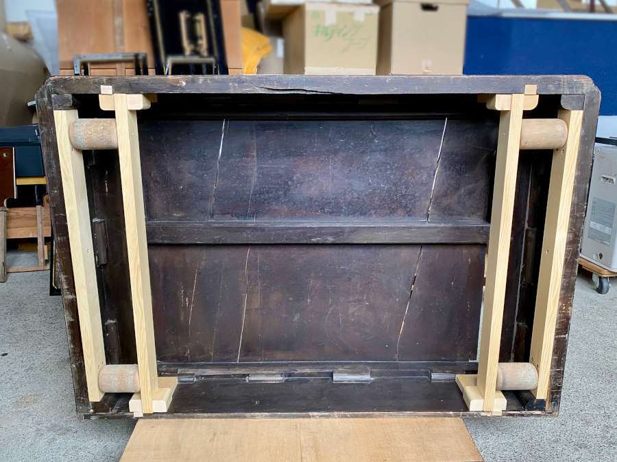 こちらはお仏壇の裏底です。移動のための「壇車」と呼ばれる木製の車輪が4つついていましたが、経年劣化でボロボロになっていました。このままではお仏壇の水平が保てず、歪みの原因になります。そこで、全ての車輪を木地職人さんがこのお仏壇に合わせて作り直して交換しました。白木の箇所が今回交換した箇所です。