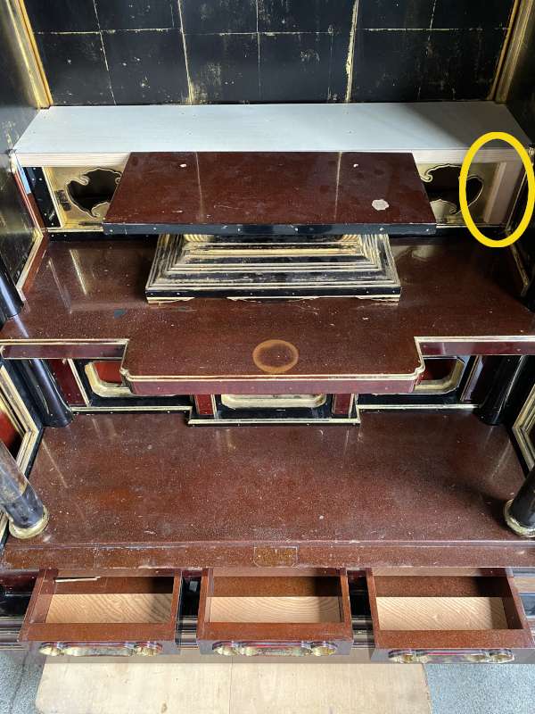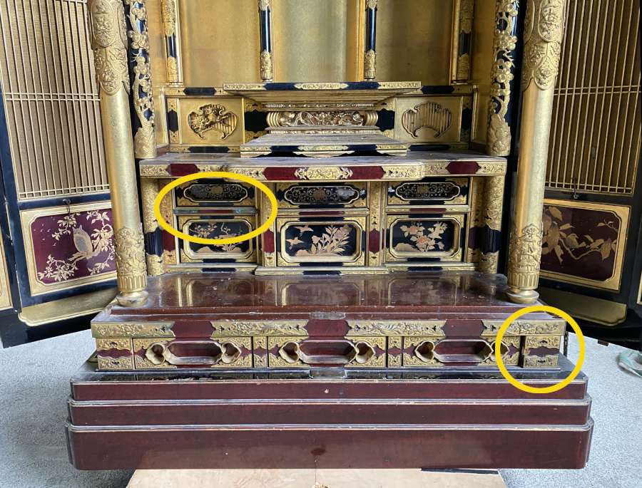 お仏壇の内部です。上段の天板は、反りのため交換しています。印のある上段ツカは、塩分のため交換しました。引き出しは、割れのため蒔絵板を交換しています。そのほかにも細かくチェックして、必要な箇所の交換を行いました。木地直しでは、反りや割れがないか、水平を保てているかなどのほか、このあと塗りの工程に入るとその分厚みが増すので、引き出しの開閉がきつくないか、ゆとりが十分にあるかなど、細部にわたって確認します。特に昔のお仏壇はゆとりが少なくきつめになっているので、木地直しでの調整が重要です。解体して初めて見えてくる部分も多く、ご予算とのバランスを考えつつ、これからも長く受け継いでいただけるよう、専門家として最良のご提案をさせていただきたいと考えております。