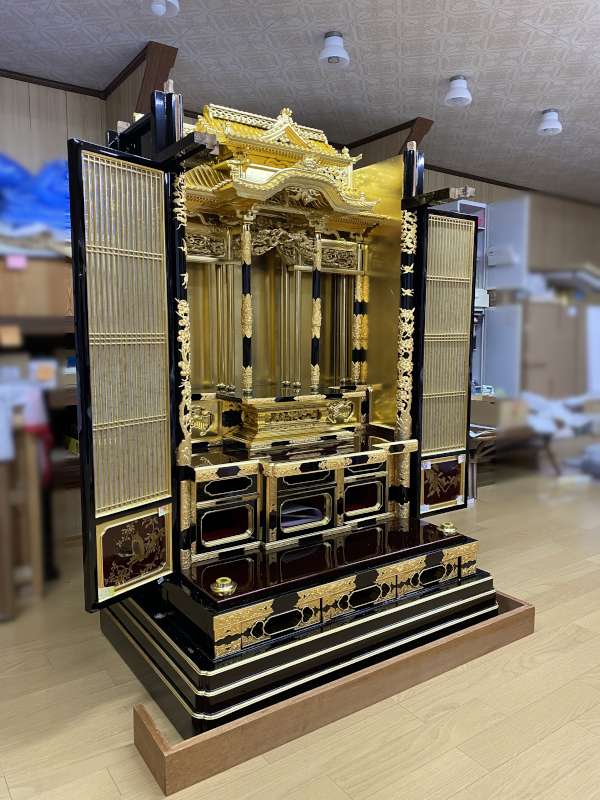 いよいよご納品の日を迎えました。彦根仏壇2尺8寸、本三方開きのお仏壇です。「2尺8寸」は、屋根の横幅が2尺8寸、約85cmということを指しています。「本三方開き」は、正面と両側面が開く通常の三方開きよりもさらに本格的な格式の高い造りです。