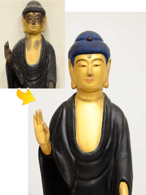 ただ新品のようにピカピカにするのではなく、あえて艶を抑えて陰影等をつけることで、長年お参りされてきた雰囲気に仕上げています。お顔の表情も穏やかに美しく蘇りました。