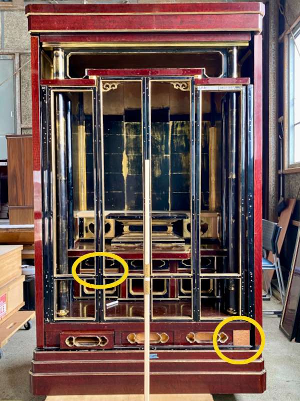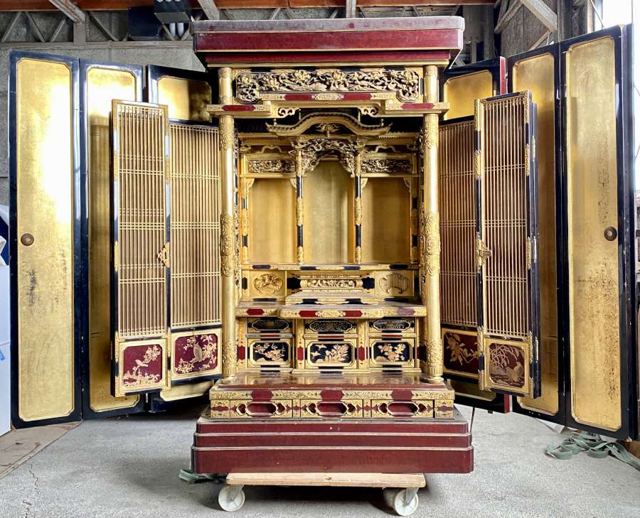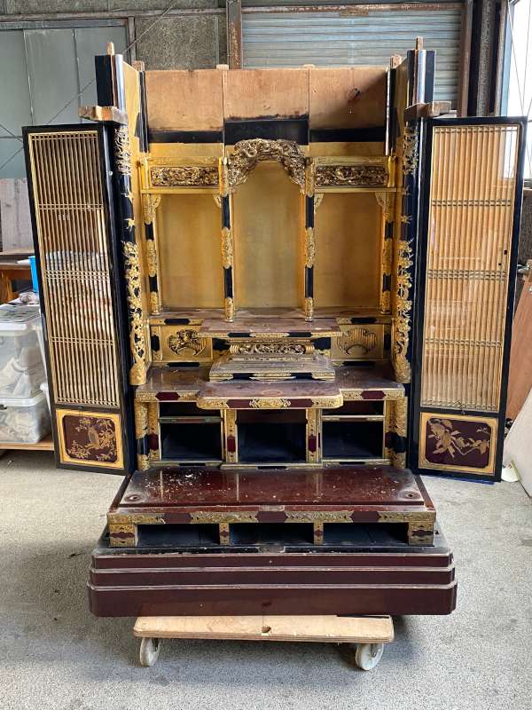 こちらが今回お預かりしたお仏壇です。約100年にわたって大切に守ってこられた彦根仏壇です。
