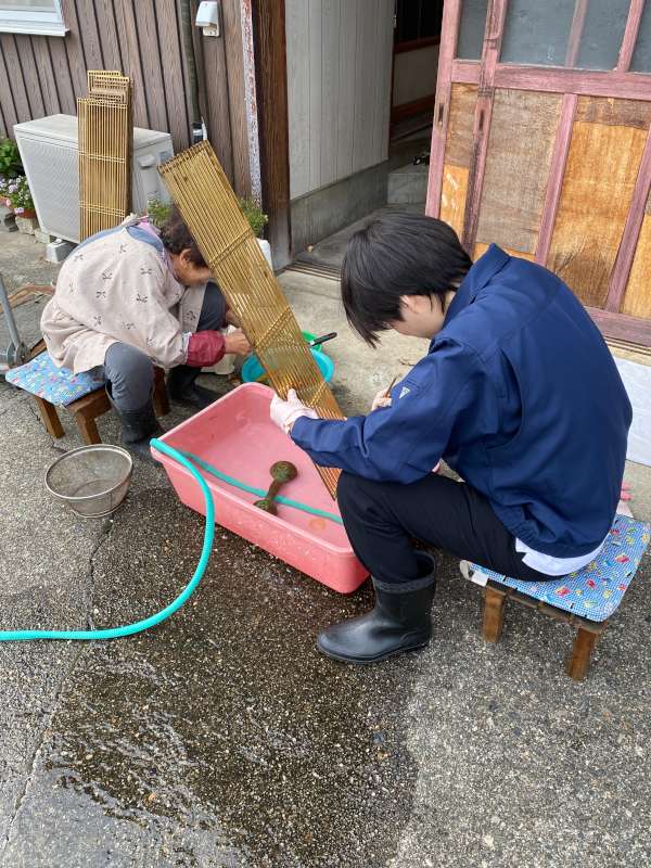 洗浄の様子です。すべての部品をひとつひとつ丁寧に洗浄し、長年の埃や煤を洗い流します。洗浄作業は、よく晴れた天気の良い日に行います。水洗いした後は、太陽の光でしっかり乾燥させます。