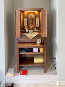 ご納品の当日は、ご自宅のすぐ近くのご実家様まで古いお仏壇の引き取りにも伺わせていただきました。仏間に合うようにサイズ等もきちんと確認くださって着実に進められて、お盆にも間に合わせることができましたので、「想像通りでよかったです」と安心されたご様子でした。このたびは、当店にてお仏壇のお買い替えをいただきましてありがとうございました。近年は住宅に和室がないことも多くなりましたので、洋室やリビングにも置けるお仏壇のニーズも増えています。そんな中、お客様のようなまだお若いご夫妻様がご自宅に和室と仏間を設けられて、お仏壇やご先祖様を祀るということを大切に考えていらっしゃるお姿を拝見し、大変うれしく思っております。これからも皆様で末永くお参りいただければ幸いです。仏事のこと等で何かお困りの際は、どうぞお気軽にご連絡くださいませ。